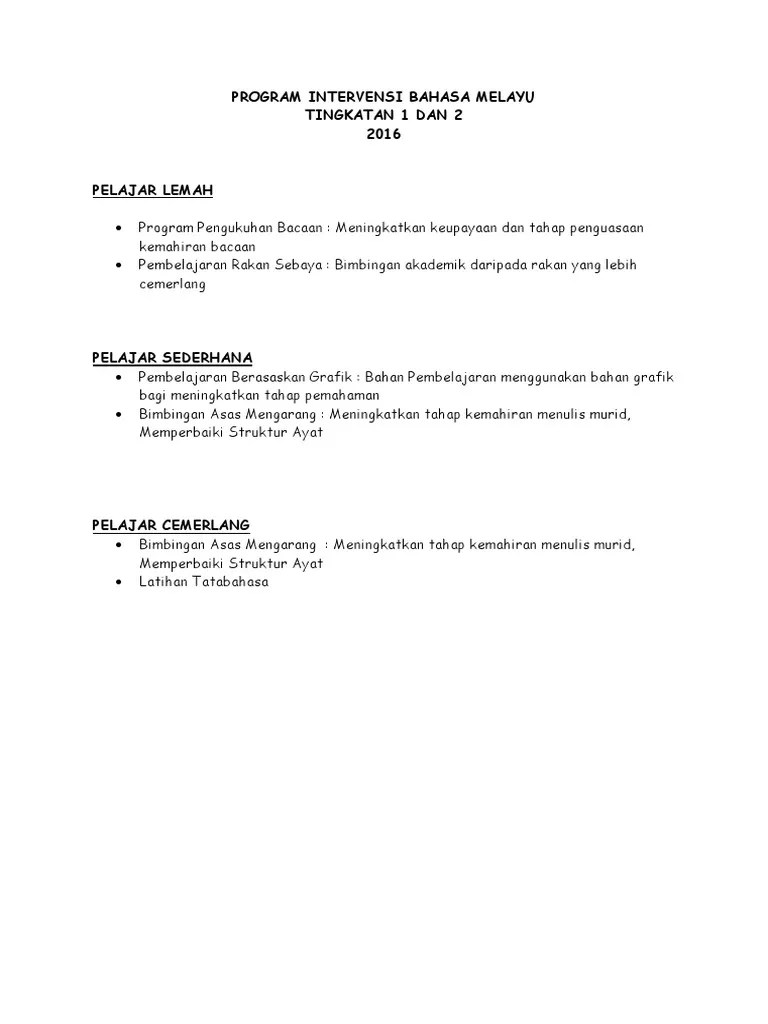 Strategi kecemerlangan spm sekolah ppt download . Bahasa melayu kump sasaran isu/masalah pelan intervensi tarikh/masa pelaksanaan 5 it/ 5 . Laporan program intervensi bahasa melayu spm 2017 . View laporan program intervensi bahasa melayu spm 2017.docx from edup 3073 at ipg kampus bahasa melayu.
